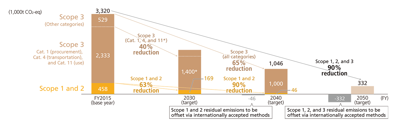 We will expand the coverage of Scope 3*3 emissions beyond Category 1 (procurement), Category 4 (transportation), and Category 11 (use) to include all categories. To strengthen our efforts, we have set a new target to reduce Scope 3 emissions by 65% from the base year by fiscal 2040. In keeping with existing net-zero targets for Scope 1, 2, and 3 by fiscal 2050, we seek to cut emissions by 90% from the base year through internal initiatives.