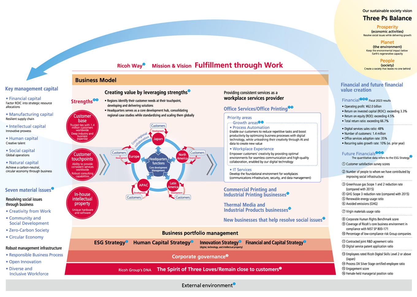 As a global workplace services provider, the Ricoh Group leverages its extensive customer base, direct touchpoints, and proprietary intellectual property to consistently generate and deliver value, enhancing worker creativity in line with customer needs. We support the evolving nature of work and empower individual creativity, with a strong focus on driving business growth and ESG-centric management to enhance corporate value.