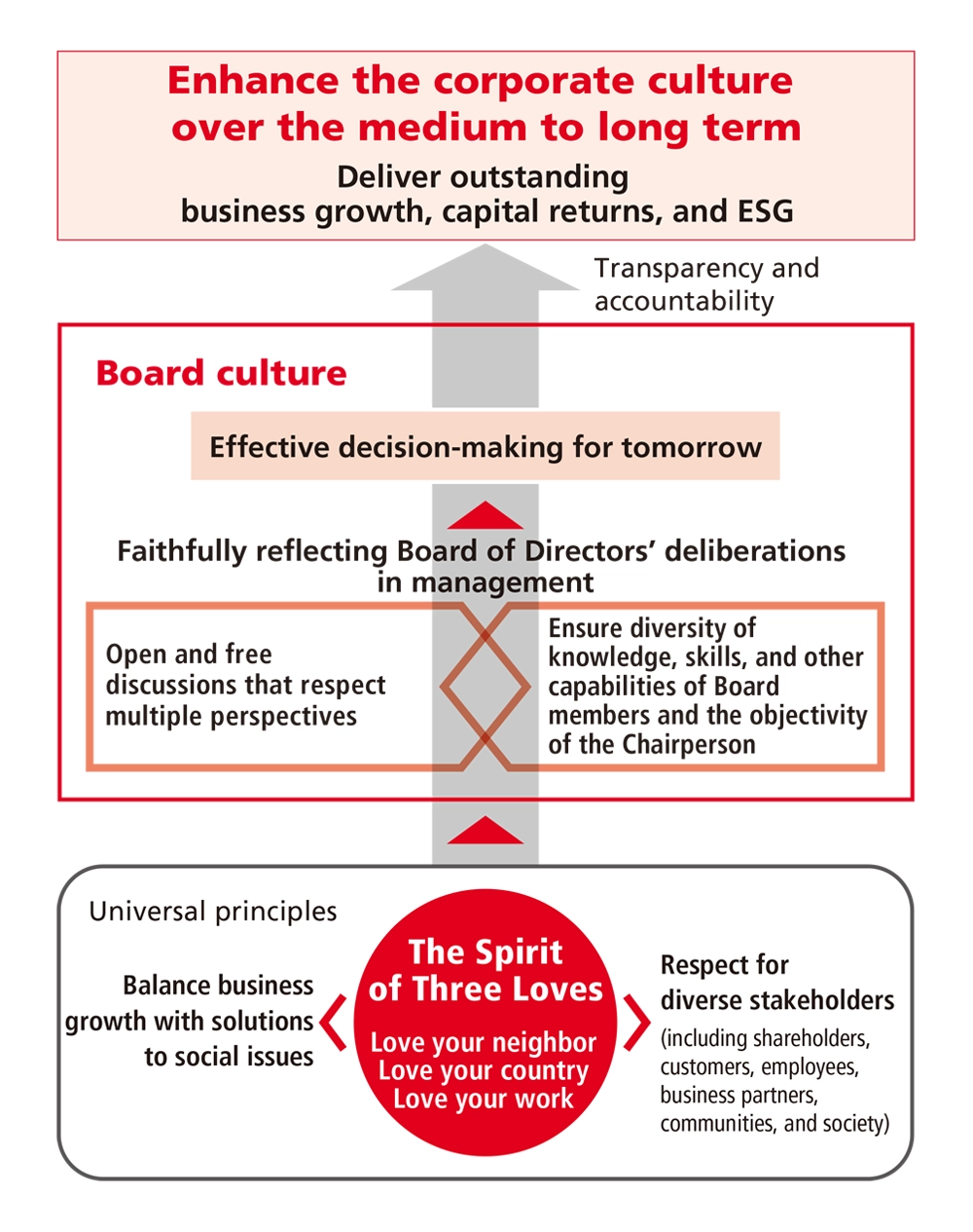 As the business climate and management structure change, the Board of Directors will continually refer to the above culture in deliberating, making decisions, choosing Directors, and engaging with shareholders and other stakeholders.