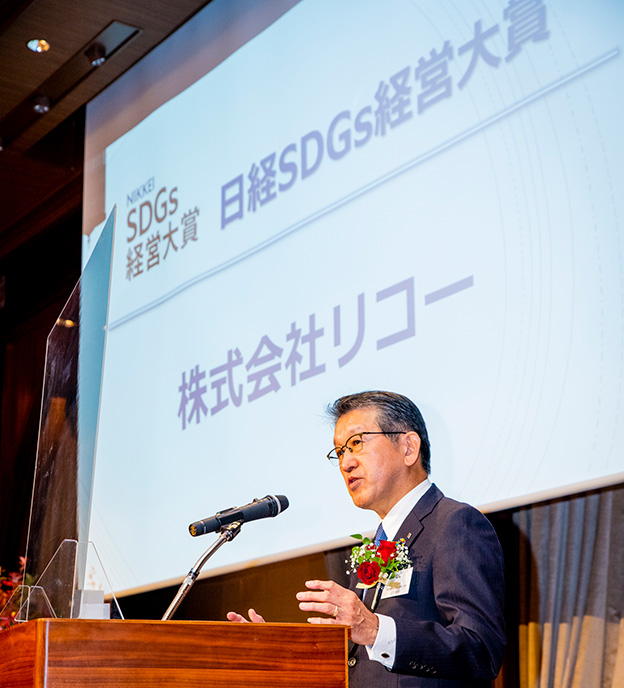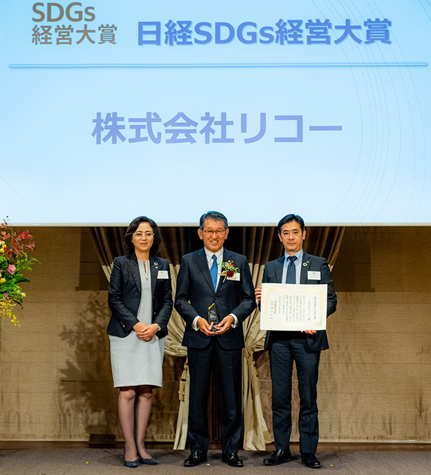 At the awards ceremony, Kunio Ito*1, Chairman of the Jury, said, “Ricoh has scored very high points in all items, and each element is linked at a high level. As a top runner in environmental management, it has laid the groundwork for a long time, but this award is a big manifestation of it as SDGs.” Also, as a groundbreaking initiative, he said that Ricoh is accelerating the use of renewable energy, such as converting all the electricity used in the production and assembly of A3 multifunction devices to 100% renewable energy. Ricoh has significantly raised its GHG (greenhouse gas) reduction target and has been certified under the new standard “1.5°C target” by the SBT (Science Based Targets) initiative.
