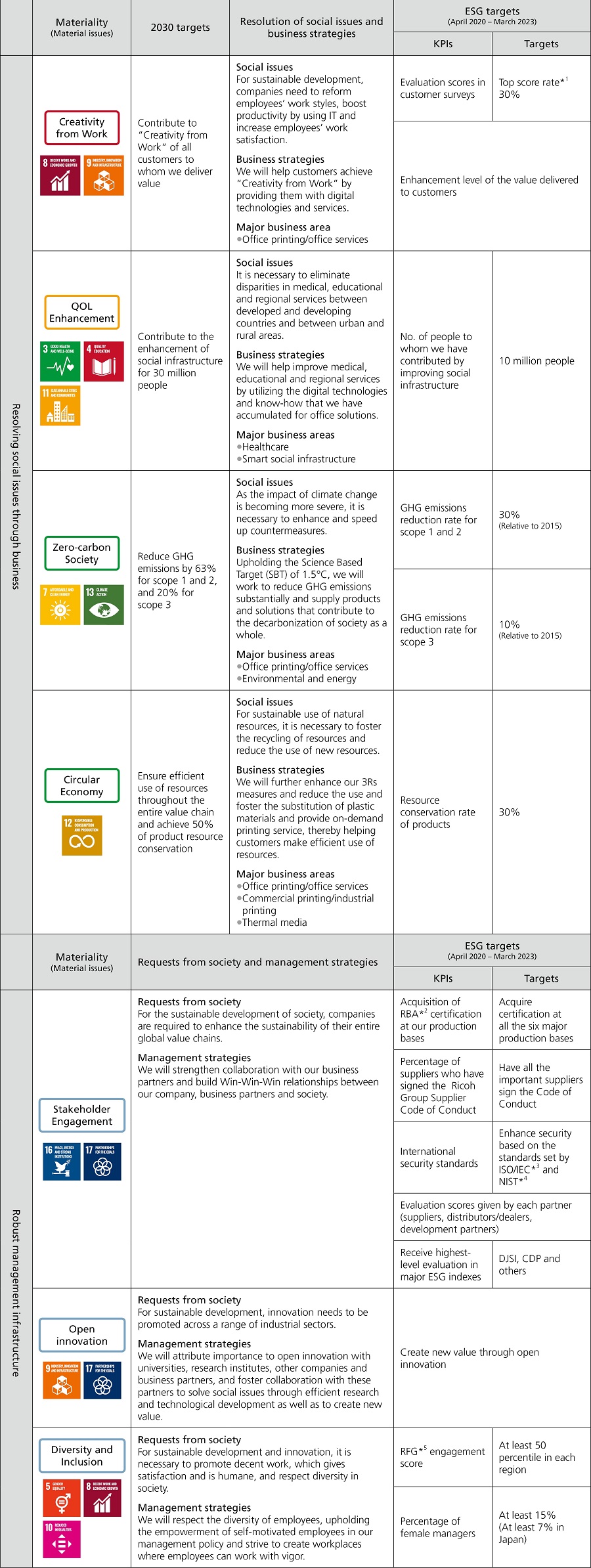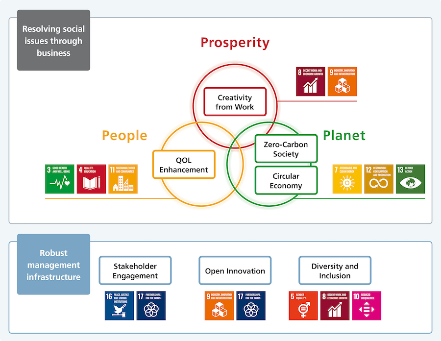 For the Ricoh Group, an ideal sustainable society is one in which the Three Ps Balance—a balance between Prosperity, People and Planet—is maintained. To create such a society, it has identified seven material issues in two areas, “Resolving social issues through business” and “Robust management infrastructure,” by reflecting Ricoh's Mission Statement, Mid-Term Management Plan (MTP), and expectations of its stakeholders. Furthermore, Ricoh has set 14 ESG goals linked to each materiality, and everyone, including management and employees, is working toward achieving those goals with a high degree of awareness. Under the slogan “Businesses that do not contribute to the SDGs will be eliminated,” Ricoh will continue to actively promote efforts to realize a sustainable society by solving social issues.