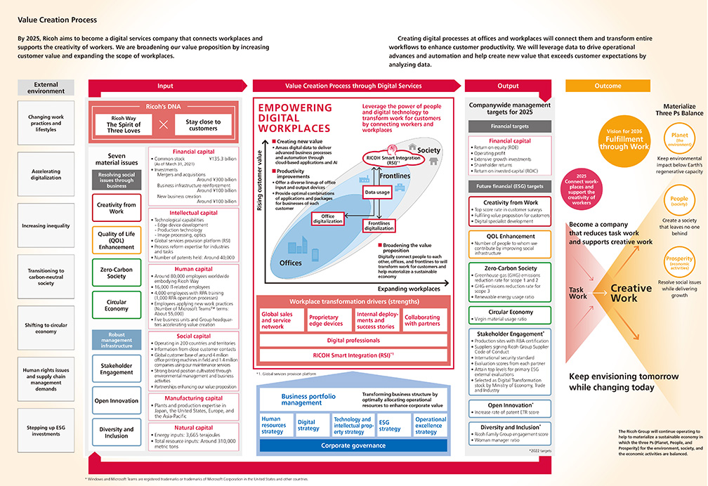 By 2025, Ricoh strives to become a digital services company that connects workplaces and supports workers' creativity. This year's report presents medium- to long-term value creation processes and initiatives and examples of how Ricoh will achieve that goal.