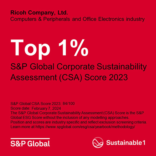 TOKYO, February 16, 2024 – Ricoh today announced it has been selected as a member of the Sustainability Yearbook 2024, with a score within the top 1%* in its industry, by S&P Global, an American company and one of the world's leaders in corporate ratings.