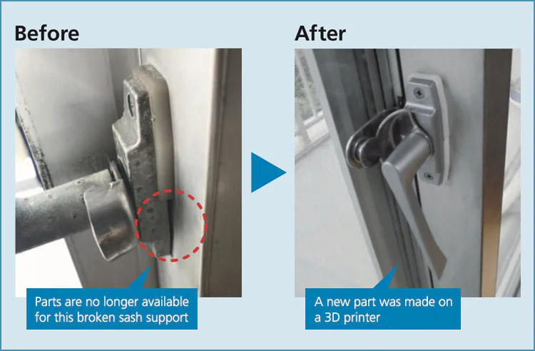 Here, Ricoh undertook several steps to generate 3D data and reproduce a damaged window sash part on a 3D printer. The customer was unable to prepare the 3D data, and asked Ricoh to reproduce the part based on an old drawing from 1978. The customer wanted 200 of these parts made. Such a small run would have been prohibitively costly with conventional manufacturing.