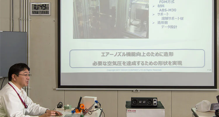 Production subsidiary Ricoh Industry has also improved things with 3D printers, using them to make proprietary air blower parts for high-efficiency exhaust fans and for cleaning recycled toner bottles.