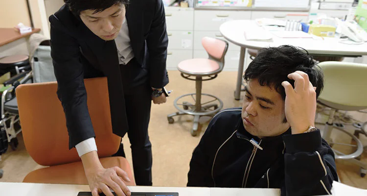A Ricoh Japan employee (left) and Asunaro caregiving head Akira Sakakibara discuss bed sensing system sensitivity and the user interface design as part of the regular feedback process.