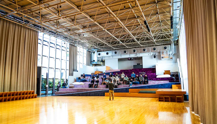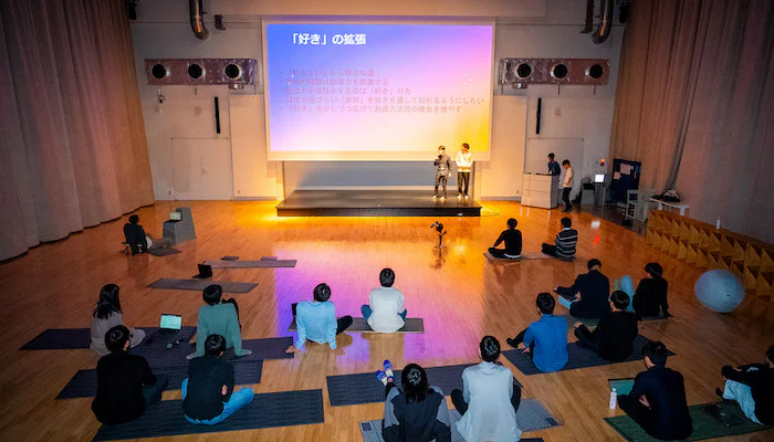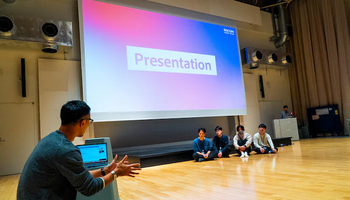 The chosen workshop setting was RICOH 3L’s BOX, a former gymnasium. As a result of remodeling, the gym occupies half of the floor space, while the other half is a carpeted grand staircase. Whiteboards cover the walls next to the stairs so people can conveniently take notes. Large cushions and stools are scattered all over that area. There is also a small stage and sound and lighting equipment, which would all be overkill for a mere gymnasium.