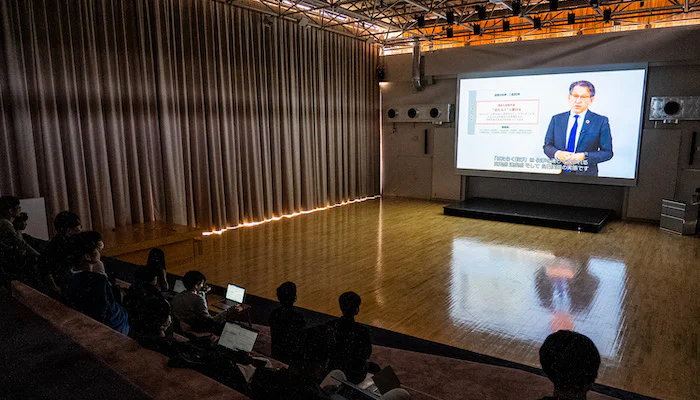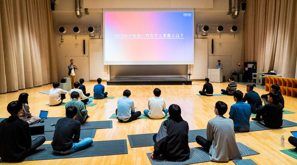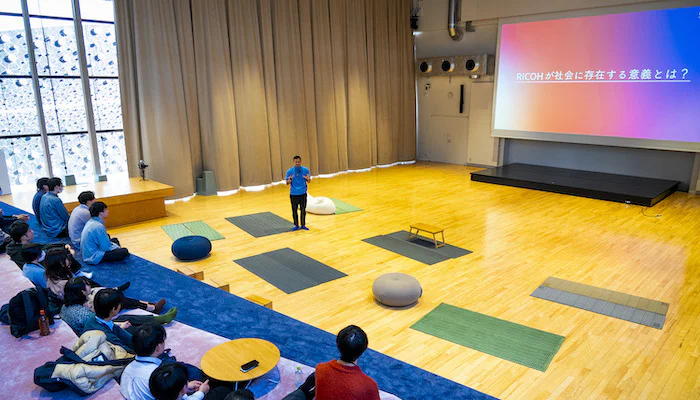 The workshop gathering at BOX started at 1:00 p.m. The curtains closed, and a loud buzz filled the darkened room. A screen lit up with a three-and-a-half-minute video. It comprised a speech by Jake Yamashita, Ricoh’s previous CEO and current chairperson, followed by a segment by Akira Oyama, his successor. Mr. Inada then delivered a 30-minute presentation on Ricoh’s Mission & Vision. He says, “For the opening, I wanted to clearly articulate why Ricoh exists by presenting insights from the company’s two most senior executives.”