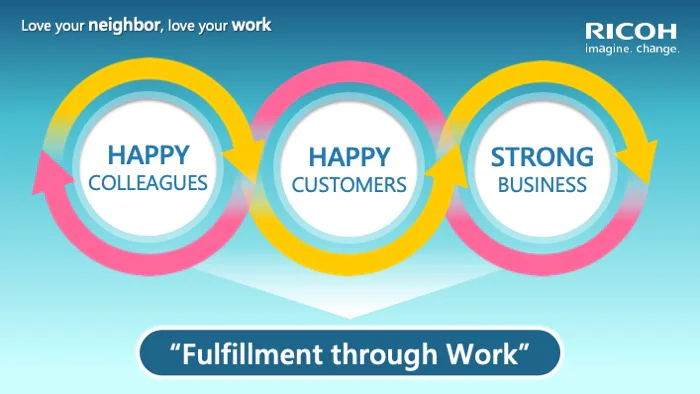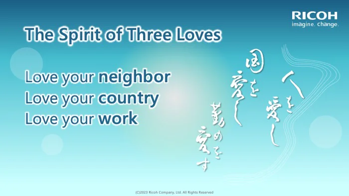 The principle of putting people at the heart of business was ahead of its time when Ricoh started 87 years ago. Our visionary founder, Kiyoshi Ichimura, formed our company guided by principles that still resonate today, treating employees with respect and equity. The founding principles formulated in 1946 are: "Love your neighbor, Love your country, Love your work."