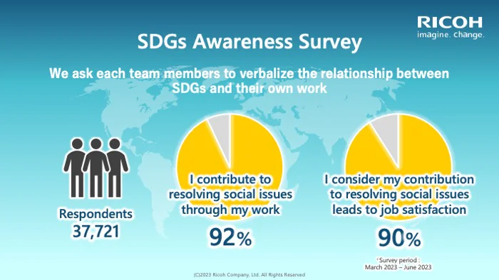 And all this means that our vision of "Fulfillment through Work" is coming to life. What we’re experiencing at Ricoh is a transformation not limited to us alone; it’s a journey everyone can embrace. We asked team members to verbalize the relationship between the SDGs and their own work, and of the nearly 38,000 responses, 92% felt their work contributed to resolving social issues, and almost the same number said it led to their job satisfaction.