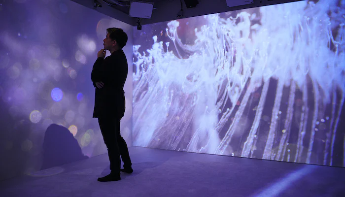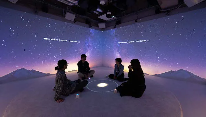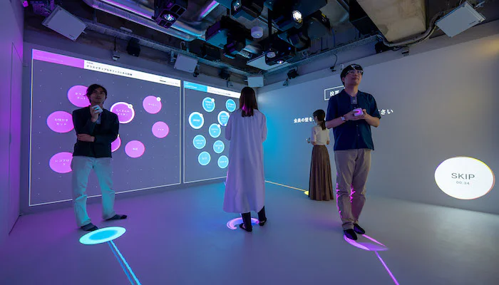 Meeting participants pass through a passage to enter a magical space of just over five square meters. All walls and the floor are screens. Depending on for the meeting purpose, participants can select and use applications from three categories in combination. One is Travel, to experience the artist-designed space. The other two are Engage, to support communication, and Organize, to maintain the body and mind.