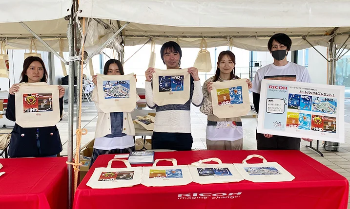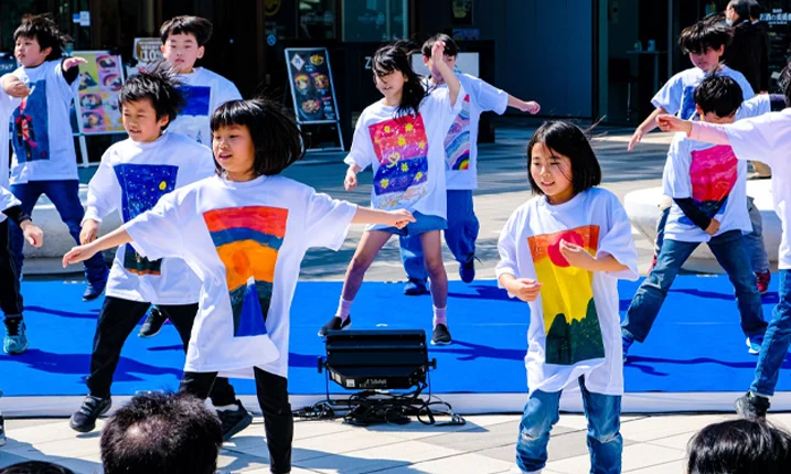 Ricoh transformed the main street into a ribbon of sky and color. Overhead, T-shirts printed with fourth-graders’ drawings from Haneda Elementary School fluttered in the breeze, creating a vivid installation. On March 22, Ricoh also hosted a live-printing booth where visitors could choose a favorite design and have it printed on an eco-bag to take home. The scene came alive when Haneda Elementary School’s third-graders wore the T-shirts on stage for a spirited dance performance.