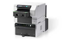A direct to garment (DTG) printer for anyone, anywhere!* RICOH Ri 100 printer with the RICOH Rh 100 finisher option.