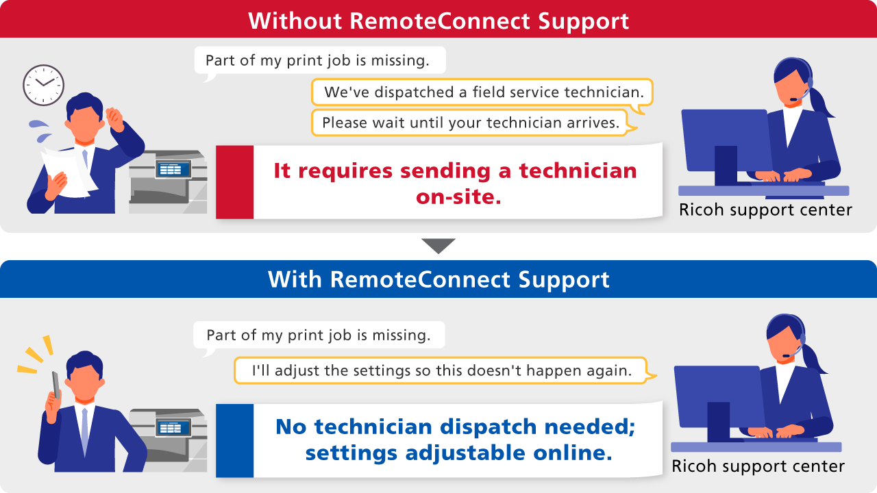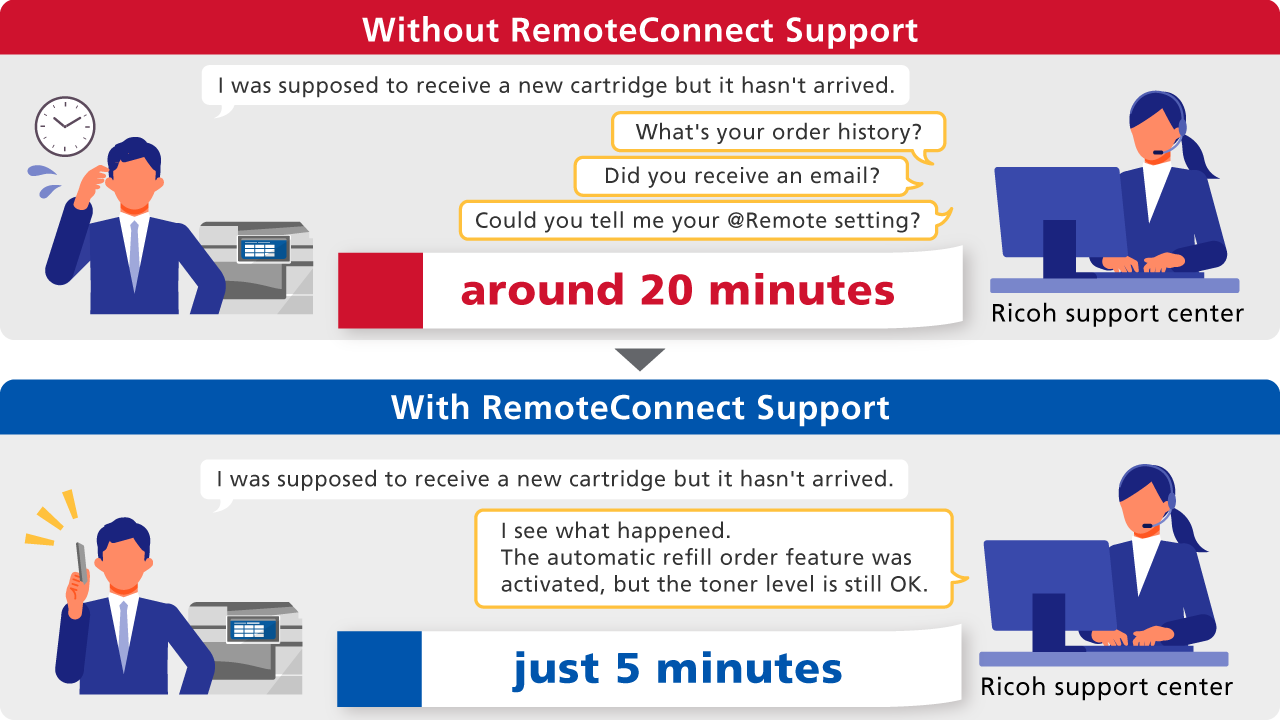 The Ricoh support center would have to check the order history, corresponding emails, and @Remote settings, which would have taken around 20 minutes.