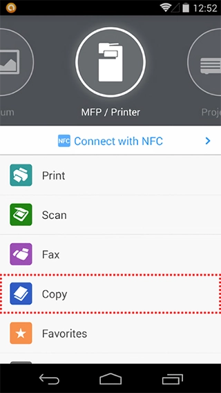 It is also possible to make copies by performing operations on a smart device. Copy settings (number of copies, b/w or color, simple or duplex, etc.) can be specified, and you can save frequently used settings as favorites.