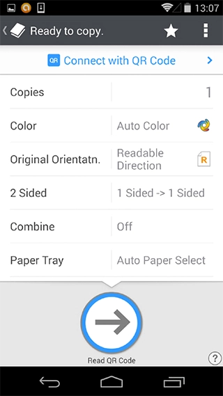 By just scanning with your smart device the QR code displayed on the multifunction product operation panel, the screen, or Interactive Whiteboard, you can easily connect to it without having to perform any troublesome device registration in advance.