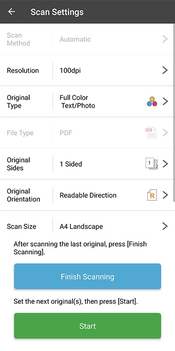 | Scan function | Settings | Saving location/destination, color/B&W, resolution, file type, read size, original sides, original orientation | |