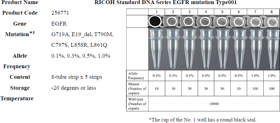Ricoh developed “RICOH Standard DNA Series EGFR mutation Type001”, a reference material for confirming the accuracy of genetic testing as a model for the cell-free DNA in the blood of lung cancer patients. The number of cancer cell–derived cell-free DNA molecules in the blood differs from one patient to another, but in over half of patients, there are fewer than 100 molecules with EGFR-activating mutants in the blood sampled for one test, and the number of resistant mutants is even smaller (according to an investigation by DNA Chip Research). “RICOH Standard DNA Series EGFR mutation Type001” was modeled on this, with 10 to 100 cancer cell–derived DNA molecules (including genetic sequences of both EGFR-activating mutants and resistant mutants) per 10,000 normal DNA molecules, dispensed into each well of 8 tubes, so it is expected that this product will be used as a reference material with a mutant allele frequency*9 of 0.1% to 1% in the evaluation of testing systems at medical institutions, testing centers, and research institutes that perform lung cancer testing. We aim to contribute to making precision medicine more accurate and improving the efficacy of treatments for lung cancer by providing this product for use in the confirmation of test accuracy in advance.