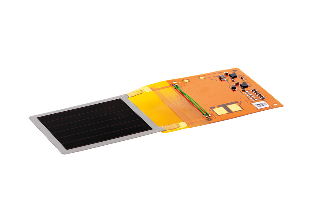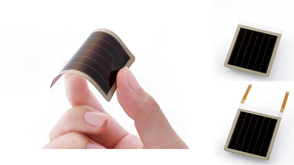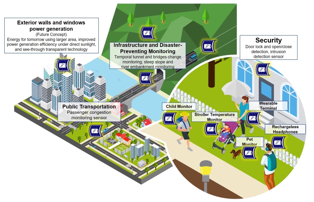 The flexible energy harvesting device, sized 41mm by 47mm, uses a unique power generation organic photovoltaic (OPV) material developed jointly from 2013 in an industry-academia collaboration with Kyushu University. The result is efficient power generation in low-light environment, such as indoors (approximately 200 lx), and medium-light such as shaded outdoor areas (approximately 10,000 lx). In addition, the thin, lightweight, and bendable film can be mounted on IoT devices of various shapes.
