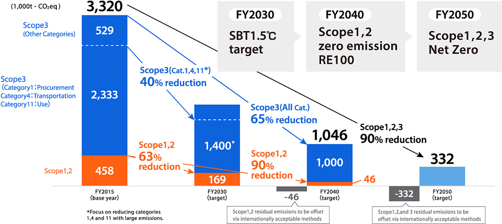 TOKYO, March 18, 2024 – Ricoh today announced its new environmental goals for 2040: net zero greenhouse gas (GHG) emissions*1 under Scope 1 and 2, 100% shift to renewable energy for electricity consumption in its business activities (RE100*2), advancing its original 2050 targets by ten years. To accelerate Ricoh's response to climate change, an urgent global issue, these goals aim to reduce 90% GHG emissions from fiscal 2015 through voluntary efforts and 10% reduction through offset by internationally acceptable methods*3. The new 2040 goals also include a 65% Scope 3 reduction rate in all categories from fiscal 2015, an expansion from 2030 Scope 3 goal of selected categories: 1 (procurement), 4 (transportation), and 11 (use). Achieving Scope 1, 2, and 3 net-zero by 2050 is another latest addition where Ricoh aims for a 90% emissions reduction from fiscal 2015 levels through voluntary efforts.