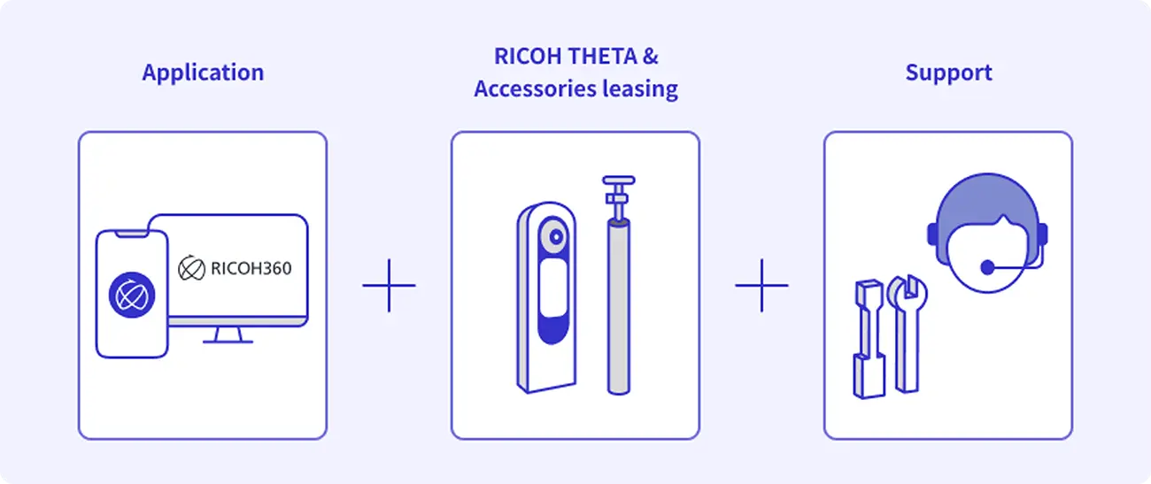 The RICOH360 Business Package seamlessly combines the RICOH THETA 360-degree camera with cloud-based image management, streamlining image recording, sharing, and management in business applications. Traditionally, on-site management required significant time and effort, involving multiple photos taken with standard cameras and uploading data to a PC or sharing via email. This solution eliminates omissions, automatically uploads immersive 360-degree data to the cloud, and leverages AI for optimal image processing. Flexible access control settings*1 ensure secure and easy data sharing, even for collaborative projects. This total solution also includes rental and support for the RICOH THETA and accessories, complete with equipment damage coverage. In the event of a malfunction, quick replacements minimize downtime.