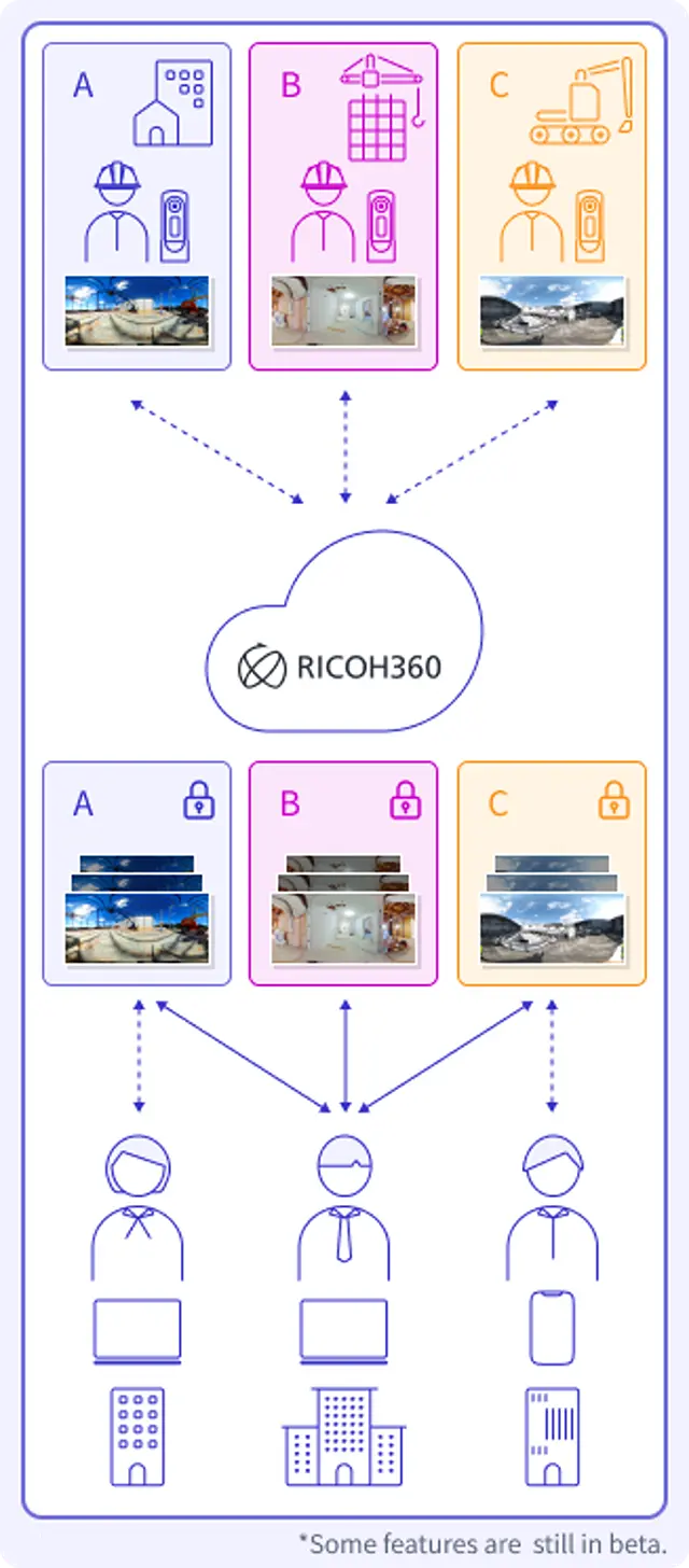 The RICOH THETA camera, capable of capturing 360-degree images in a single shot, is increasingly utilized in construction, facilities management, and other business environments where recording, sharing, and managing information remotely is essential. The RICOH360 Business Package, which integrates cloud capabilities with the RICOH THETA camera, specifically addresses the following challenges: