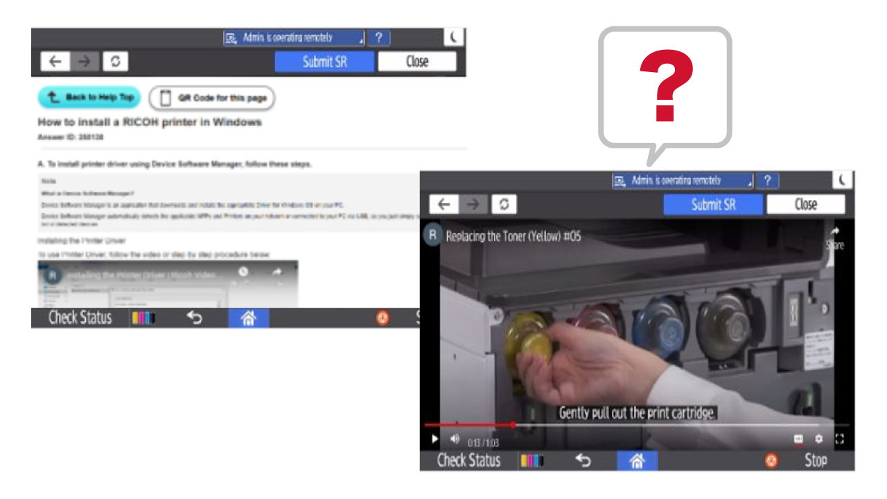 Users can easily search for solutions to common issues, such as how to use duplex printing, directly from the MFP panel, supporting quick problem resolution. If needed, a service request can also be submitted on the spot, eliminating the need for additional procedures by phone or PC, and allowing users to promptly return to their work.