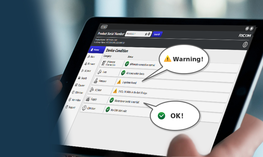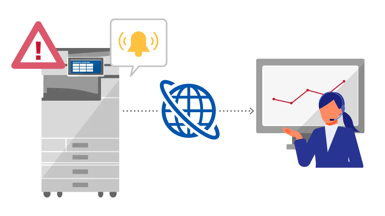 Field engineers monitor the status of your MFP in real time and detect any issues immediately. If something happens, they identify the problem and cause before visiting your site, so that they can quickly restore your machine and optimize field service.