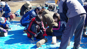 “That's Kirin Saver” activities are planned in accordance with the cycle of the seasons. Major tasks conducted from spring to summer include weeding to allow the sun to reach ground-level vegetation and promote its growth and other forest maintenance work as well as creating wood chips. In autumn, flora and fauna surveys are carried out, which is followed by the late autumn activity of raking up fallen leaves. The coldest period, from late November to the end of winter, is the season for forest thinning. Some of the trees removed in the thinning process are used as logs for cultivating shiitake mushrooms, with spawn inoculation performed in February. In combination with the forest maintenance activities, several seasonal recreational events are also planned, such as tree climbing, mushroom inoculation, and rice-cake making, with the intention of facilitating local community activities.