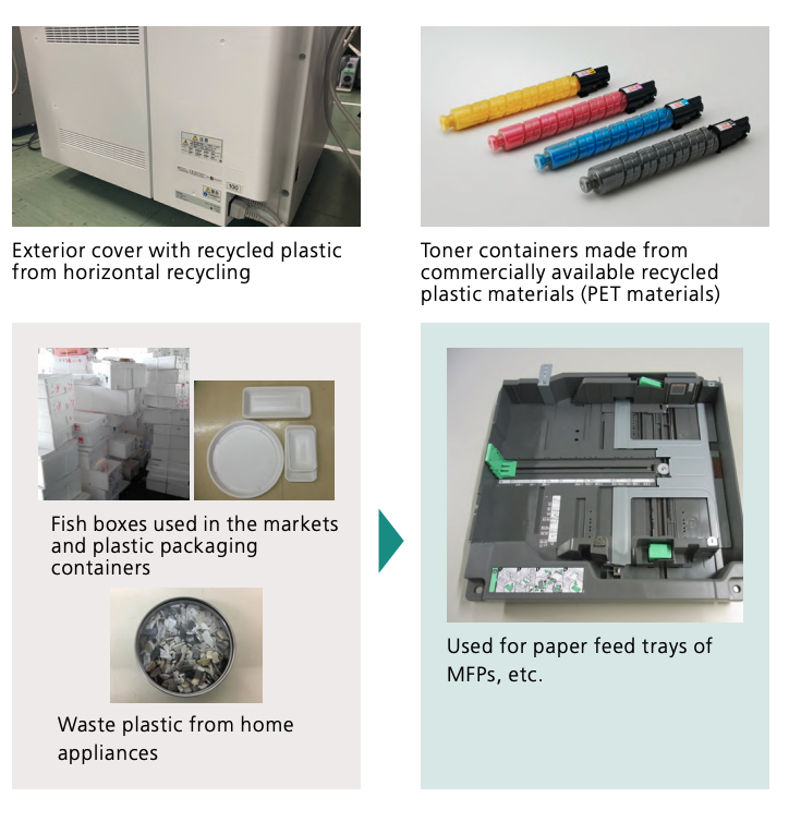 Through this, we have realized horizontal recycling that recycles collected exterior and inner parts into those that require the same high quality characteristics (flame resistance, durability, strength, etc.) In addition, from 2016, using commercially available recycled plastic materials*1, we have developed a recycled plastic that can be used repeatedly for inner parts, and we have begun using it in combination with a similarly developed recycled exterior plastic for MFPs.