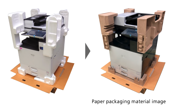 The A3 Color MFPs“ RICOH IM C6010/C5510/C4510/C3510/C3010/C2510/C2010” released in February 2023 switched to a pulp mold that uses waste paper as raw materials and uses approximately 54% less plastic packaging material than its predecessor.