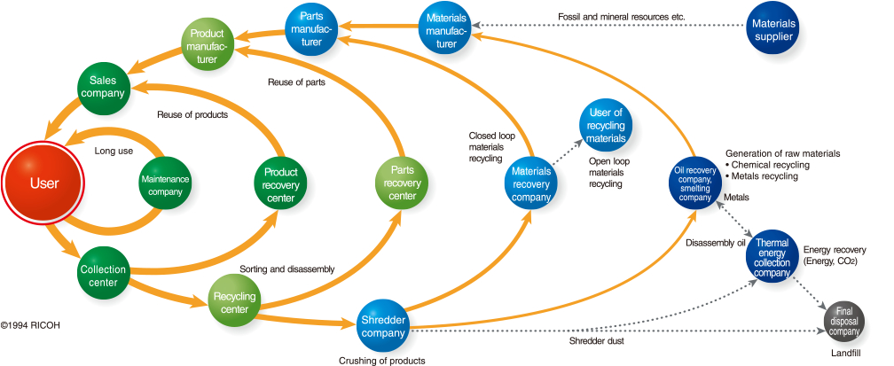 Ricoh supports the realization of a circular economy through our efforts to efficiently circulate resources at each of the three stages: when products are manufactured, when products and services are used by customers, and after products are used.