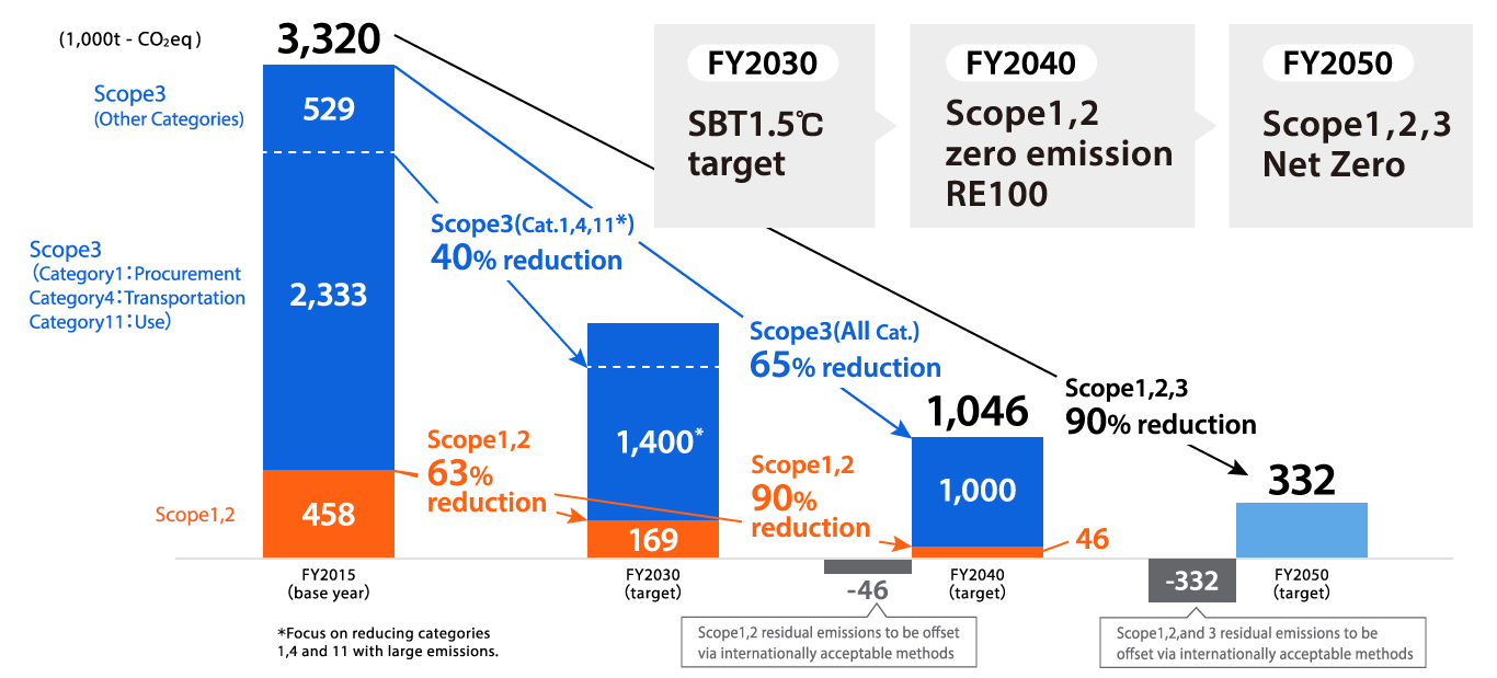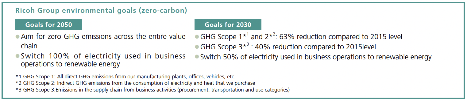 The Ricoh Group aims to achieve net zero GHG emissions by 2050. 2040 goals are net zero GHG emissions in Scope 1 and 2, and a 100% renewable energy ratio for the electricity used in our business activities. Moreover we have obtained SBT 1.5°C certification for our 2030 target, which is consistent with the level required to limit the rise in global temperature to less than 1.5°C in Scope 1, 2, and 3.