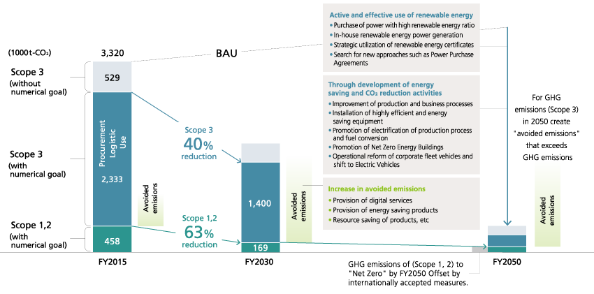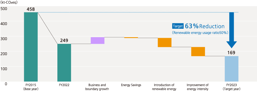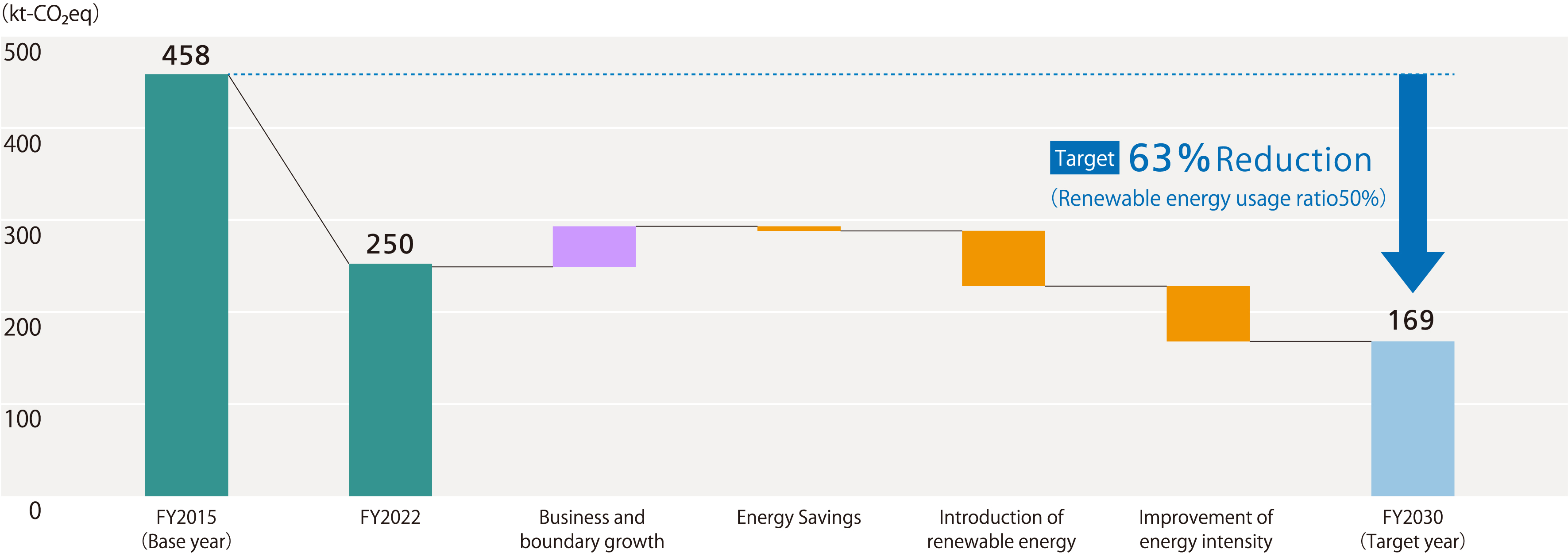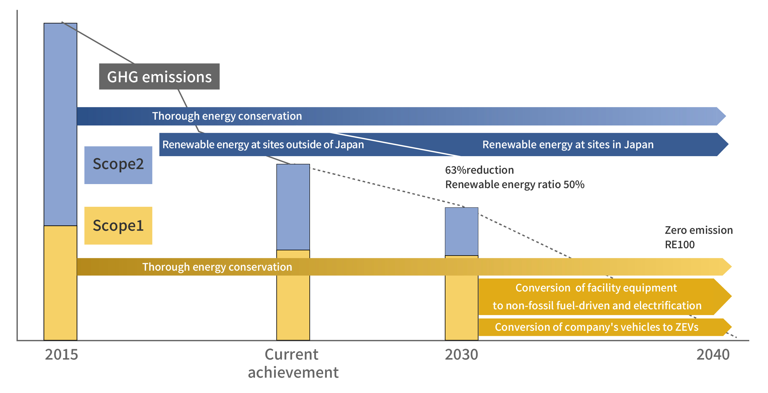 In addition, we set a target for reducing GHG emissions as one of the companywide ESG targets established as part of our mid-term management strategy, and at the same time, we set a target for reducing GHG emissions for each business unit, for which we conduct forecast and performance management for each business year. We analyze environmental performance data compiled by our cloud system for our approximately 900 global sites and use this data for PDCA management.