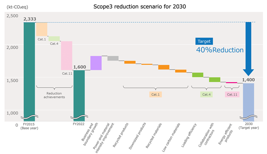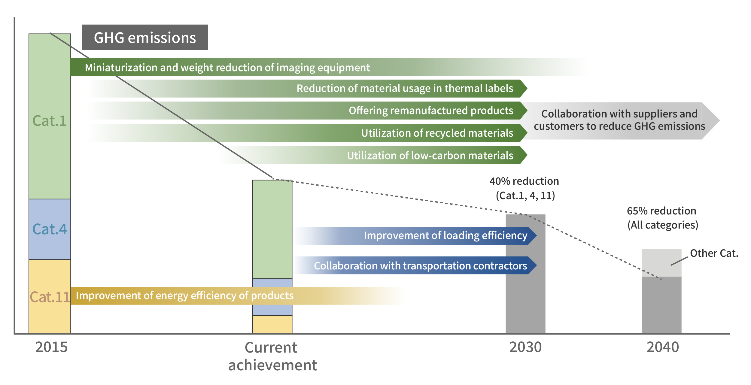 2030 Scope 3: Initiatives and Plans for 40% ReductionWe will work together with the entire value chain, including suppliers, customers, and transportation contractors, to achieve a Scope 3 reduction. *The figures in diagram below are based on fiscal year 2022 when the target was set, and revisions to past year's emissions due to subsequent organizational changes within the Ricoh Group are not reflected. Scope3 reduction scenario for 2030 <Expected reduction by activity towards FY2030 (starting from FY2022 when the target was established)> *The figures in diagram below are based on fiscal year 2022 when the target was set, and revisions to past year's emissions due to subsequent organizational changes within the Ricoh Group are not reflected.