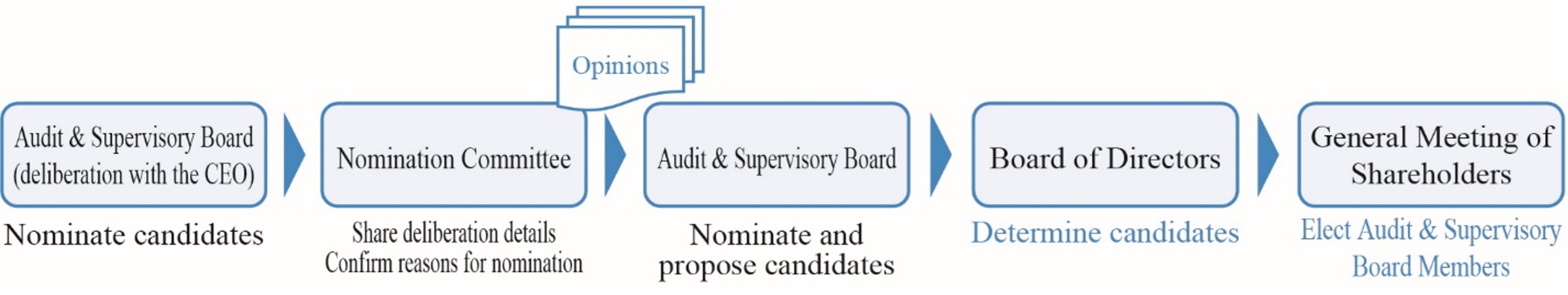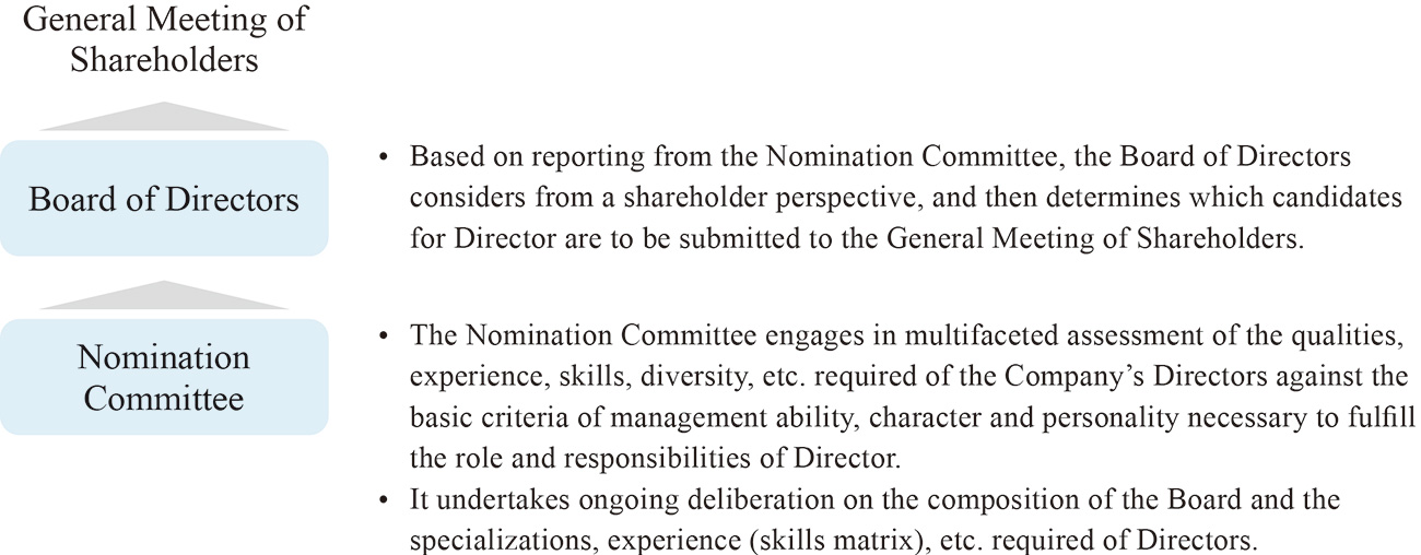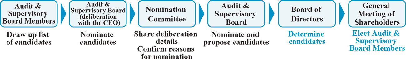 Audit & Supervisory Board Members draw up a list of candidates for Audit & Supervisory Board Members based on the election criteria for Audit & Supervisory Board Members in deliberation with the CEO as necessary. Audit & Supervisory Board deliberates, nominates and proposes candidates to the Board of Directors after confirmation by the Nomination Committee.