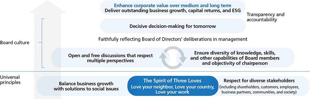 The Board of Directors reflected on Ricoh's founding principles and discussed the ideas and principles of the Board of Directors and the Directors, which are the basis for deliberations, decisions, and actions that contribute to enhancing corporate value. It accordingly established the “Board Culture,” which should be maintained and cultivated by itself explicitly as follows.