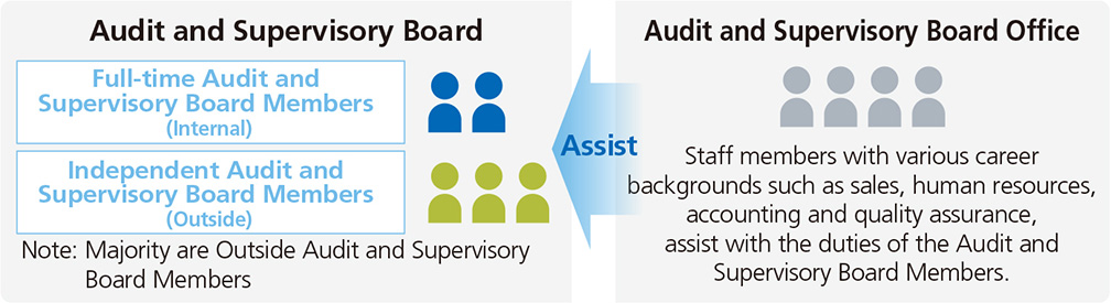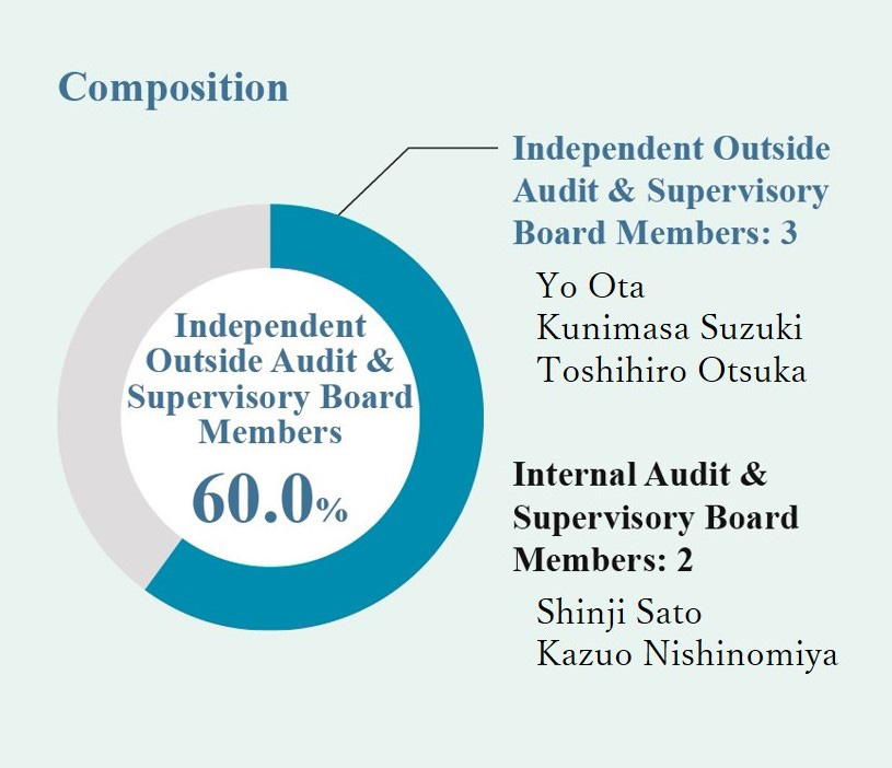 The Company has five Audit & Supervisory Board Members, comprising two (2) full-time members who are familiar with internal circumstances and three outside members who meet the requirements for independent Audit & Supervisory Board Member set by the Company, and the majority of the members are independent Outside Audit & Supervisory Board Members. In addition, the Audit & Supervisory Board is required to secure necessary knowledge, experience, and specialized abilities in a well-balanced manner in forming the Audit & Supervisory Board. We have built a system that enables deep discussions from an independent and objective perspective, capitalizing on a wealth of experience and wide-ranging insight in the specialized fields of each Audit & Supervisory Board Member.