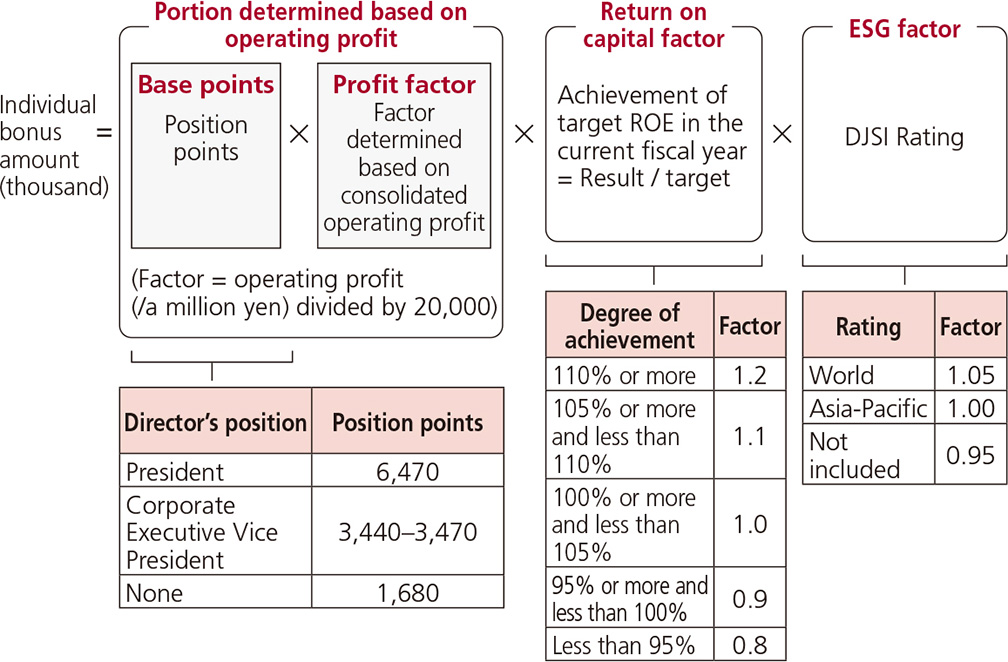In addition, the Compensation Committee deliberates on the appropriateness of individual bonus payment amounts based on the results calculated by the formula for calculating Directors' bonuses below, including the results of the evaluation of Directors by the Nomination Committee, and make recommendations to the Board of Directors, which then decides whether or not to submit a proposal for the payment of bonuses to Directors to the General Meeting of Shareholders.