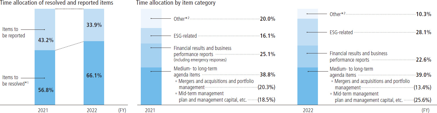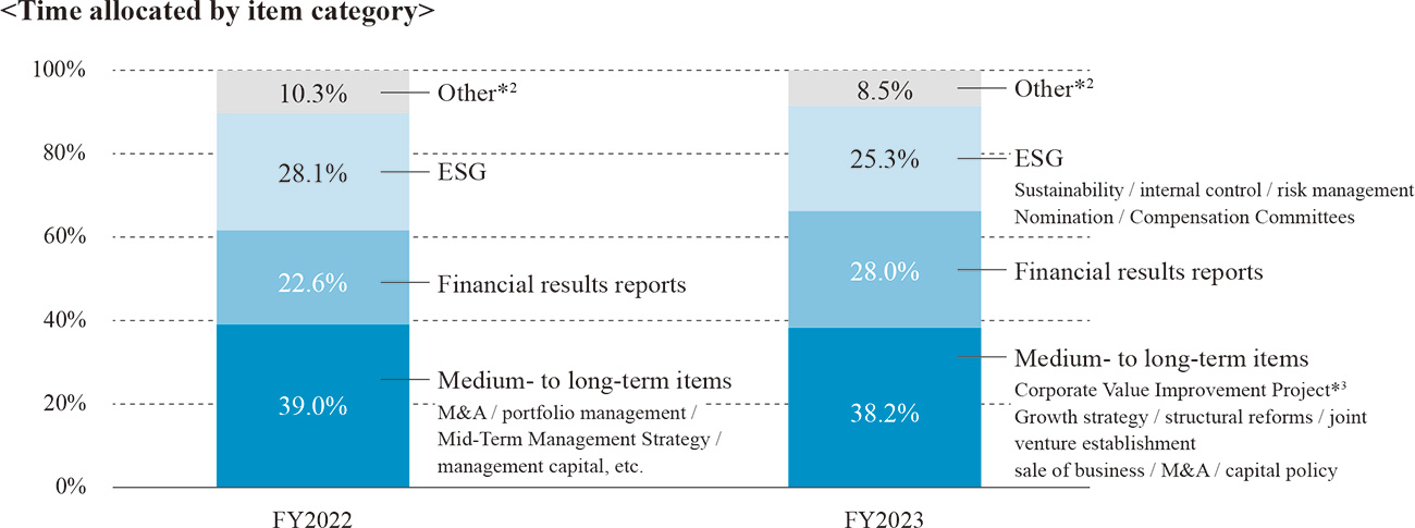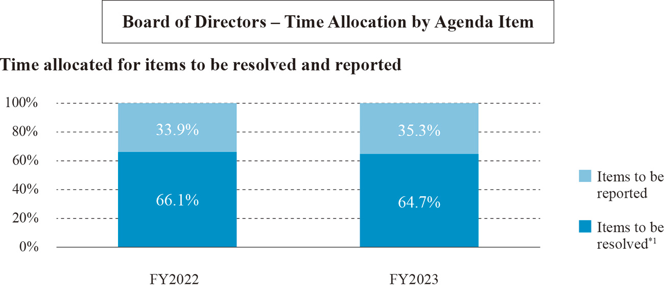 Furthermore, we continuously conducted on-site inspections by Outside Directors and Outside Audit & Supervisory Board Members, roundtable discussions with local employees, and participation in management meetings as observers to gain understanding of the Company's actual situation. In addition, we enhanced information sharing with Directors and Audit &: Supervisory Board Members through prior briefings, aiming to improve the quality of discussions at Board of Directors meetings and to exercise effective supervisory functions. The allocation of time to agenda items at meetings of the Company's Board of Directors held in fiscal 2023 is disclosed as follows, for the purpose of ensuring the transparency in the status of deliberations of the Board of Directors.
