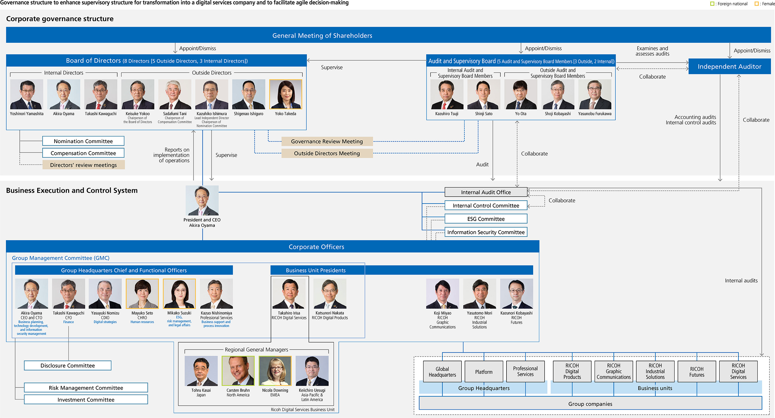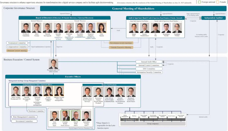 The Ricoh Group is working to enhance its governance system in accordance with social awareness and various stakeholders aimed at strengthening competitiveness and continuously improving the system while ensuring transparency based on corporate ethics and legal compliance. In this way, the Ricoh Group will achieve continuous growth, and improve corporate value and shareholder value.