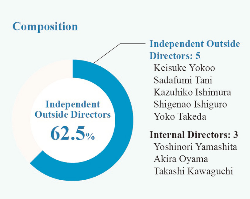 With regards to the composition and operation of the Board of Directors, the Company ensures that Independent Outside Directors on the Board of Directors constitute a majority, and the Board of Directors is chaired by an Independent Outside Director, taking into account the principles and attitudes outlined in our Board Culture. Thus, the Company aims to secure transparency in its management and further improve fair decision-making. In fiscal 2023, five (5) of the eight (8) Directors were Independent Outside Directors. In addition, the Company appoints a Lead Independent Director to enable Outside Directors to better fulfill their roles and functions on the Board of Directors. The Lead Independent Director will be responsible for improving and enhancing governance in collaboration with the Chairperson of the Board of Directors, and will serve as the leader of Independent Outside Directors at the Company. The appointment of the Lead Independent Director will be made as necessary based on the judgment of the Board of Directors considering the Company's management situation and the appointment of the Chairperson of the Board of Directors and the Directors. Appropriate collaboration and division of roles by the Chairperson of the Board of Directors and the Lead Independent Director will ensure the smooth operation of the Board of Directors and the fulfillment of its functions.