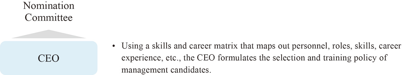 The Nomination Committee deliberates on the development plan for future CEO candidates and provides guidance to the CEO, who, in the next fiscal year, provides growth opportunities suited to each candidate according to their individual goals, allowing the candidates to gain experience. The CEO also provides direct guidance to promote the candidate's development based on individual assessment.