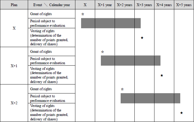 The number of points to be granted for fiscal year X is determined on a single fiscal year basis after the evaluation over a performance evaluation period of three fiscal years, including fiscal year X and two subsequent fiscal years (X+1 year and X+2 years) and three years (X+3 years) after the end of the performance evaluation period (three fiscal years), and shares are issued accordingly. Similarly, the number of points to be granted for fiscal year X+1 is determined on a single year basis after the evaluation over a performance evaluation period of three fiscal years, including fiscal year X+1 and two subsequent fiscal years (X+2 years and X+3 years) and three years (X+4 years) after the end of the performance evaluation period (three fiscal years), and shares are issued accordingly.