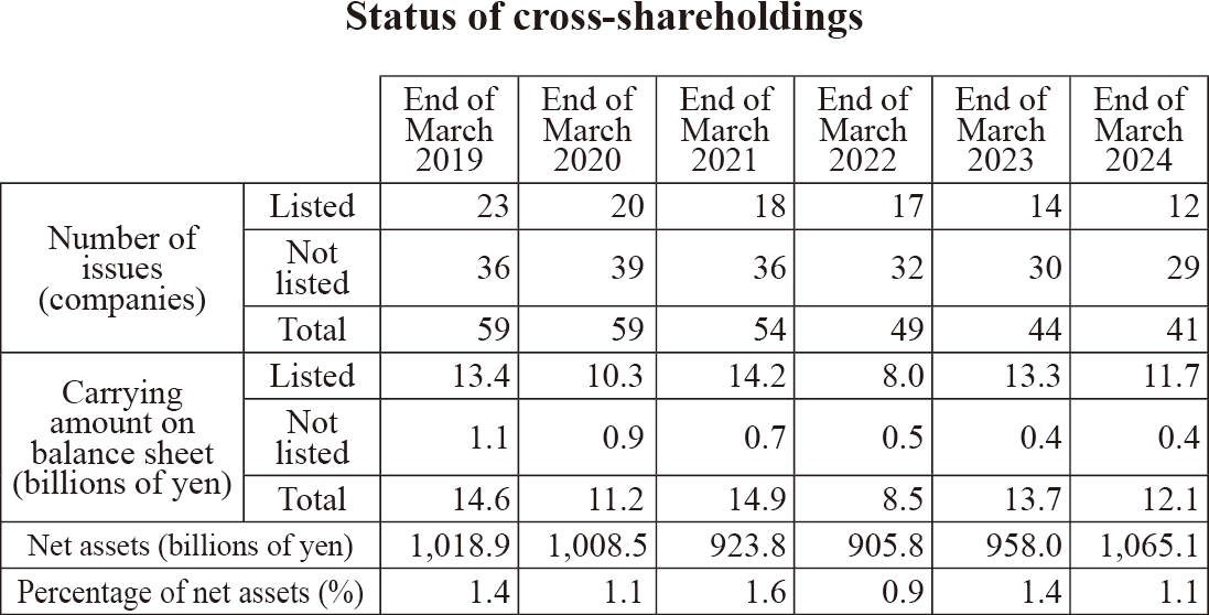 The Company will exercise voting rights attached to cross-shareholdings upon examining each agenda whether it enhances the corporate value of the investee in the medium- to long-term, or whether it impairs shareholder value, and will determine approval or disapproval.