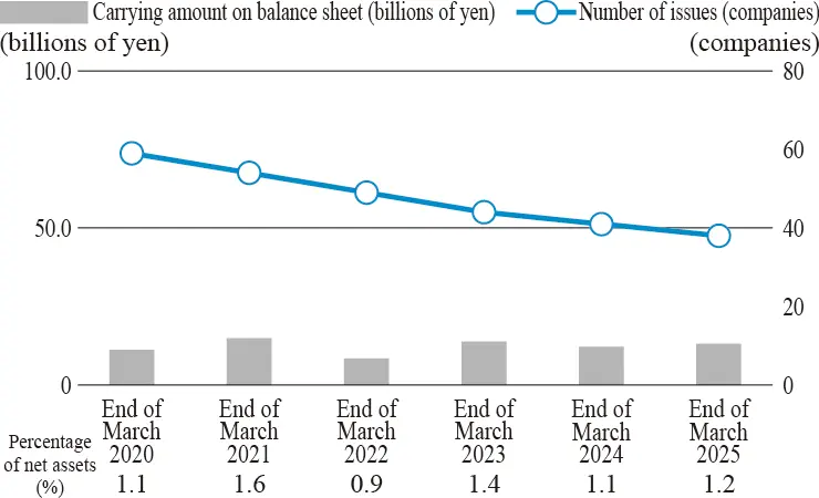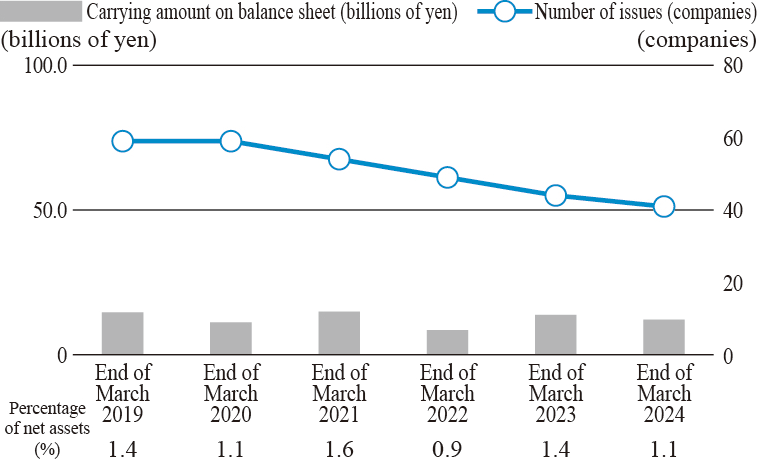 From the viewpoint of streamlining and strengthening of business alliance and development of collaborative businesses, the Company shall be able to hold shares of the related partners only when such holding of shares is deemed necessary and effective for the future development of the Ricoh Group, while taking the returns suchas dividends into consideration.Specifically, the Board of Directors will verify, for each issue, whether the benefits and risks of holding shares are worth the capital cost, and if holding shares loses significance in the medium- to long-term, they will be reduced accordingly.