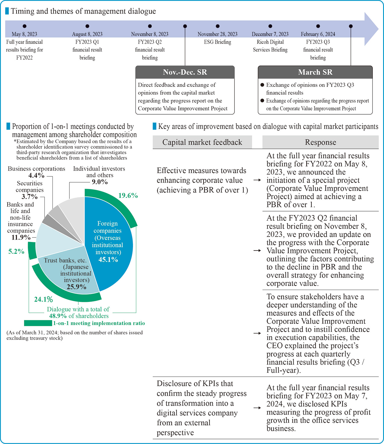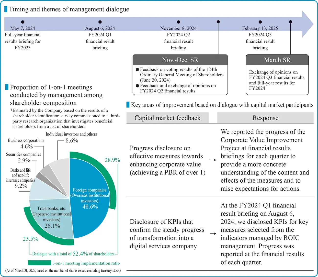 | Main dialogue opportunities | Large and small meetings such as medium- to long-term strategy briefings, financial results briefings, and business briefings, as well as 1-on-1 individual dialogues are conducted. In addition, briefings are held at externally sponsored IR events and conferences as appropriate |
