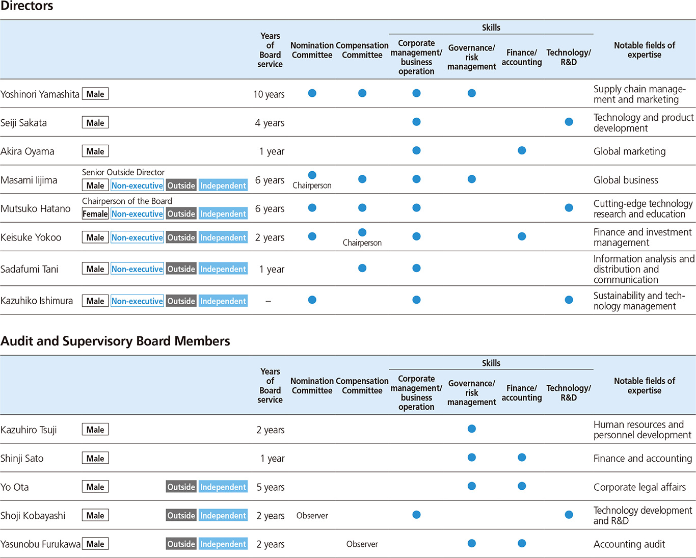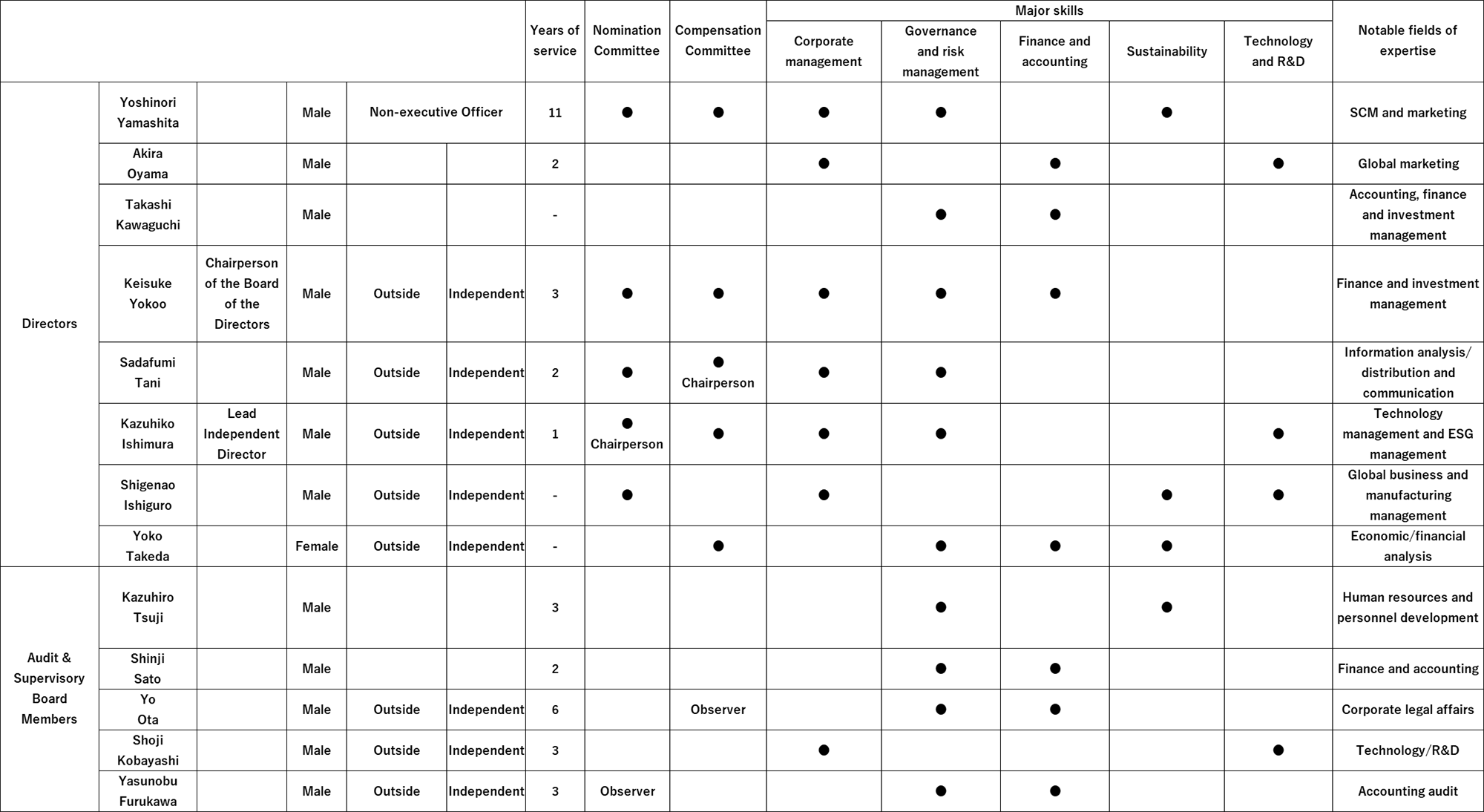 The compositions of the Board of Directors and Audit and Supervisory Board, as well as expertise of each Director and Audit and Supervisory Board Member are as follows.