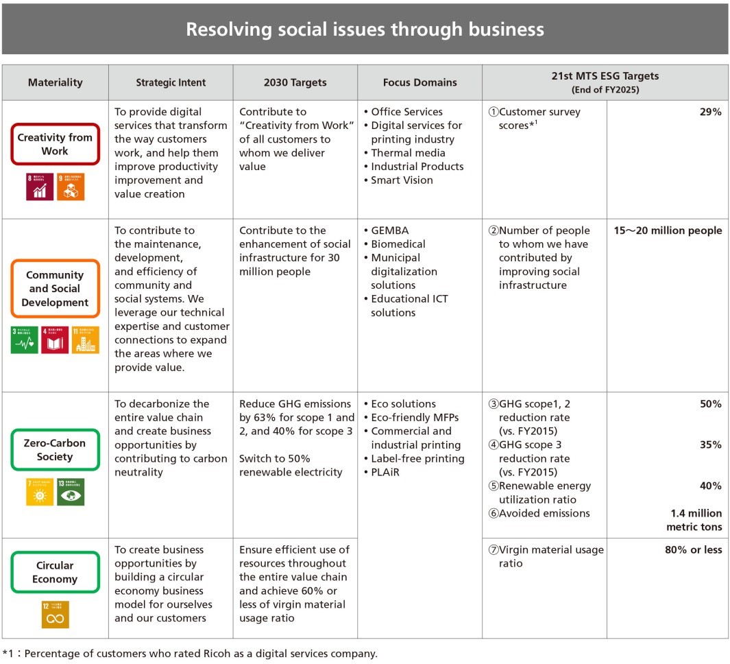 The Ricoh Group's policy is to “Align ESG with business growth.” We position ESG initiatives as future financial targets because we look for them to bear financial fruit three to five years hence. We identify four material issues for “Resolving social issues through Business”, and we regard them as particularly significant business opportunities. By leveraging our strengths in these areas, we aim to drive further business growth. We would like to introduce our activities.