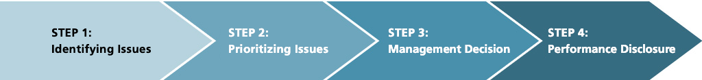 In considering our mid-term management strategy, we assess the risks and business opportunities arising from changes in environmental and social trends—such as increasing demands to address climate change and human rights. At the same time, we evaluate the impact of our business activities on the environment and society, and identify key issues that require action.
